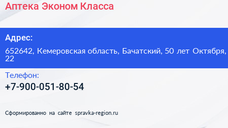 Аптека Эконом Класса по адресу 652642, Кемеровская область, Бачатский, 50 лет Октября, 22 в дальнейшем Организация, размещена в следующих категориях:
