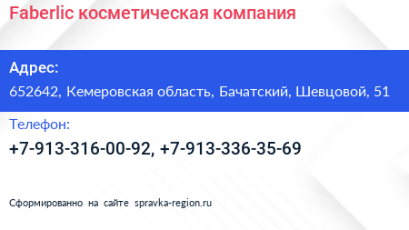 Faberlic, косметическая компания по адресу 652642, Кемеровская область, Бачатский, Шевцовой, 51 в дальнейшем Организация, размещена в следующих категориях: