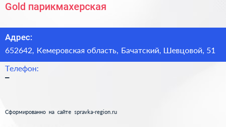 Gold, парикмахерская по адресу 652642, Кемеровская область, Бачатский, Шевцовой, 51 в дальнейшем Организация, размещена в следующих категориях: