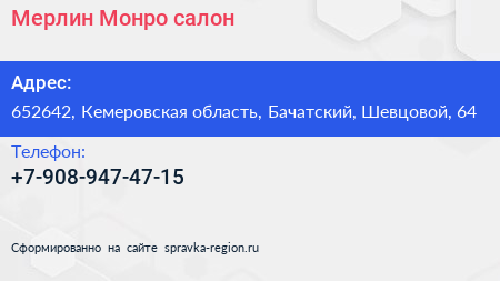 Мерлин Монро, салон по адресу 652642, Кемеровская область, Бачатский, Шевцовой, 64 в дальнейшем Организация, размещена в следующих категориях: