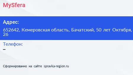 MySfera по адресу 652642, Кемеровская область, Бачатский, 50 лет Октября, 26 в дальнейшем Организация, размещена в следующих категориях: