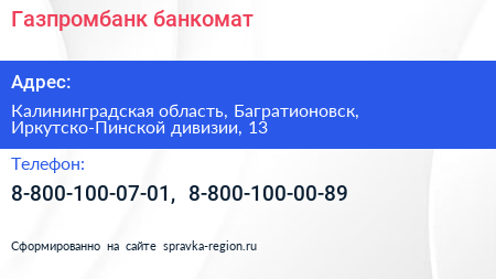 Газпромбанк, банкомат по адресу Калининградская область, Багратионовск, Иркутско-Пинской дивизии, 13 в дальнейшем Организация, размещена в следующих категориях: