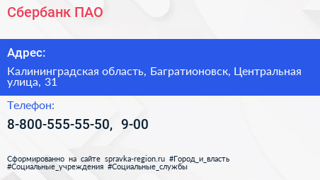 Сбербанк, ПАО по адресу Калининградская область, Багратионовск, Центральная улица, 31 в дальнейшем Организация, размещена в следующих категориях: