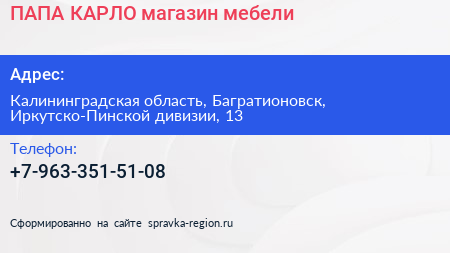 ПАПА КАРЛО, магазин мебели по адресу Калининградская область, Багратионовск, Иркутско-Пинской дивизии, 13 в дальнейшем Организация, размещена в следующих категориях: