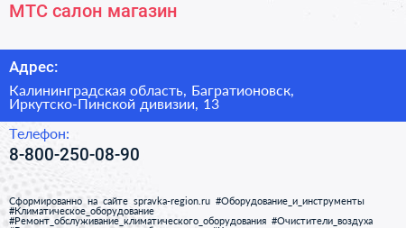 МТС, салон-магазин по адресу Калининградская область, Багратионовск, Иркутско-Пинской дивизии, 13 в дальнейшем Организация, размещена в следующих категориях: