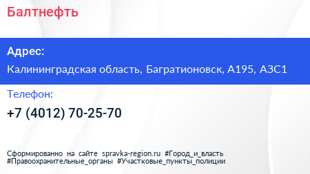 Балтнефть по адресу Калининградская область, Багратионовск, А195, АЗС1 в дальнейшем Организация, размещена в следующих категориях: