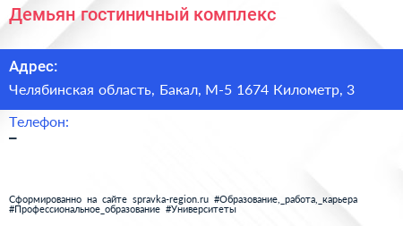 Демьян, гостиничный комплекс по адресу Челябинская область, Бакал, М-5 1674 Километр, 3 в дальнейшем Организация, размещена в следующих категориях: