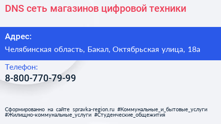 DNS, сеть магазинов цифровой техники по адресу Челябинская область, Бакал, Октябрьская улица, 18а в дальнейшем Организация, размещена в следующих категориях: