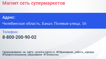 Магнит, сеть супермаркетов по адресу Челябинская область, Бакал, Полевая улица, 16 в дальнейшем Организация, размещена в следующих категориях: