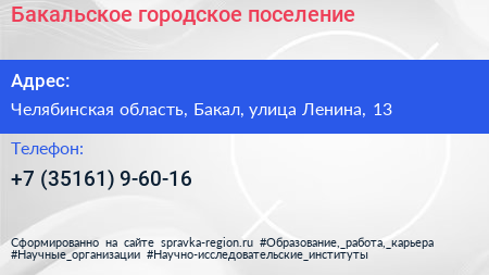 Бакальское городское поселение по адресу Челябинская область, Бакал, улица Ленина, 13 в дальнейшем Организация, размещена в следующих категориях: