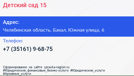Детский сад №15 по адресу Челябинская область, Бакал, Южная улица, 6 в дальнейшем Организация, размещена в следующих категориях: