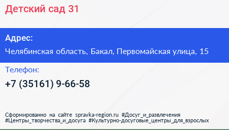 Детский сад №31 по адресу Челябинская область, Бакал, Первомайская улица, 15 в дальнейшем Организация, размещена в следующих категориях: