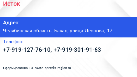 Исток по адресу Челябинская область, Бакал, улица Леонова, 17 в дальнейшем Организация, размещена в следующих категориях: