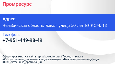 Промресурс по адресу Челябинская область, Бакал, улица 50 лет ВЛКСМ, 13 в дальнейшем Организация, размещена в следующих категориях: