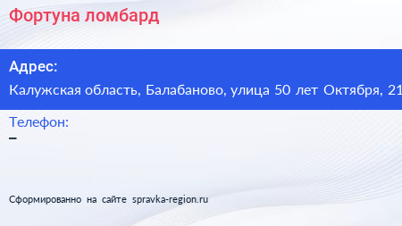 Фортуна, ломбард по адресу Калужская область, Балабаново, улица 50 лет Октября, 21 в дальнейшем Организация, размещена в следующих категориях: