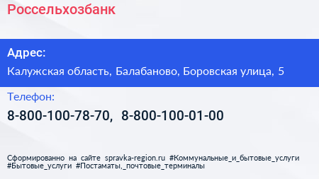 Россельхозбанк по адресу Калужская область, Балабаново, Боровская улица, 5 в дальнейшем Организация, размещена в следующих категориях: