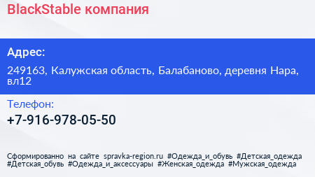 BlackStable, компания по адресу 249163, Калужская область, Балабаново, деревня Нара, вл12 в дальнейшем Организация, размещена в следующих категориях:
