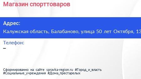 Магазин спорттоваров по адресу Калужская область, Балабаново, улица 50 лет Октября, 13 в дальнейшем Организация, размещена в следующих категориях:
