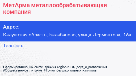 МетАрма, металлообрабатывающая компания по адресу Калужская область, Балабаново, улица Лермонтова, 16а в дальнейшем Организация, размещена в следующих категориях: