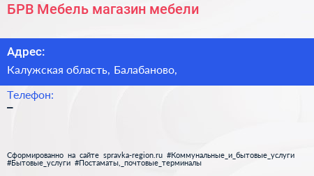 БРВ-Мебель, магазин мебели по адресу Калужская область, Балабаново, в дальнейшем Организация, размещена в следующих категориях: