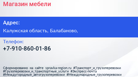 Магазин мебели по адресу Калужская область, Балабаново, в дальнейшем Организация, размещена в следующих категориях:
