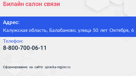 Билайн, салон связи по адресу Калужская область, Балабаново, улица 50 лет Октября, 6 в дальнейшем Организация, размещена в следующих категориях: