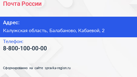 Почта России по адресу Калужская область, Балабаново, Кабаевой, 2 в дальнейшем Организация, размещена в следующих категориях: