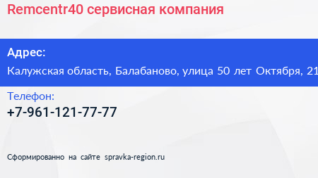 Remcentr40, сервисная компания по адресу Калужская область, Балабаново, улица 50 лет Октября, 21 в дальнейшем Организация, размещена в следующих категориях: