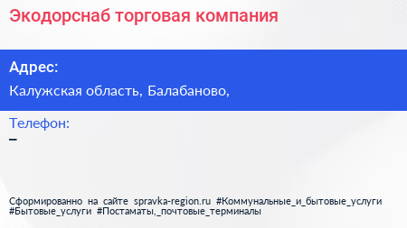 Экодорснаб, торговая компания по адресу Калужская область, Балабаново, в дальнейшем Организация, размещена в следующих категориях: