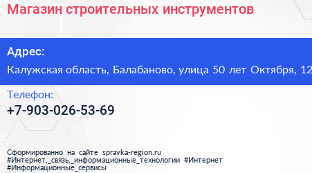 Магазин строительных инструментов по адресу Калужская область, Балабаново, улица 50 лет Октября, 12а в дальнейшем Организация, размещена в следующих категориях: