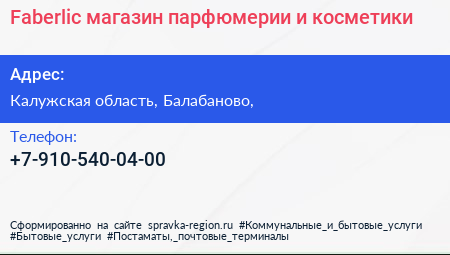 Faberlic, магазин парфюмерии и косметики по адресу Калужская область, Балабаново, в дальнейшем Организация, размещена в следующих категориях: