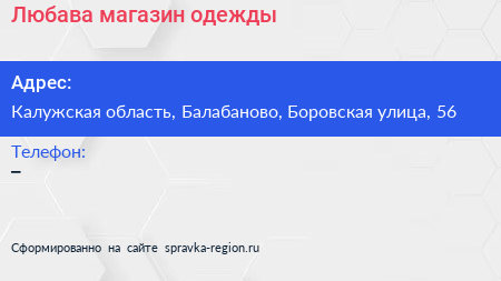 Любава, магазин одежды по адресу Калужская область, Балабаново, Боровская улица, 56 в дальнейшем Организация, размещена в следующих категориях: