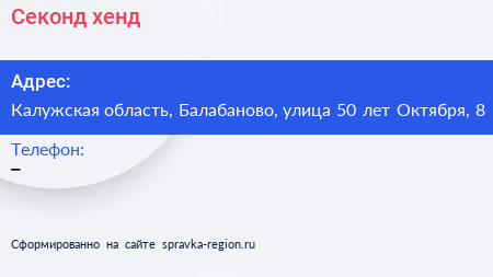 Секонд-хенд по адресу Калужская область, Балабаново, улица 50 лет Октября, 8 в дальнейшем Организация, размещена в следующих категориях: