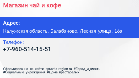Магазин чай и кофе по адресу Калужская область, Балабаново, Лесная улица, 16а в дальнейшем Организация, размещена в следующих категориях:
