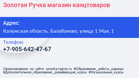Золотая Ручка, магазин канцтоваров по адресу Калужская область, Балабаново, улица 1 Мая, 1 в дальнейшем Организация, размещена в следующих категориях: