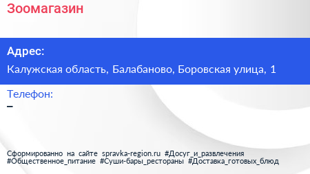 Зоомагазин по адресу Калужская область, Балабаново, Боровская улица, 1 в дальнейшем Организация, размещена в следующих категориях: