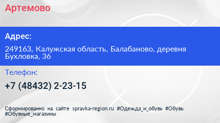 Артемово по адресу 249163, Калужская область, Балабаново, деревня Бухловка, 36 в дальнейшем Организация, размещена в следующих категориях: