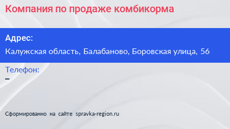 Компания по продаже комбикорма по адресу Калужская область, Балабаново, Боровская улица, 56 в дальнейшем Организация, размещена в следующих категориях: