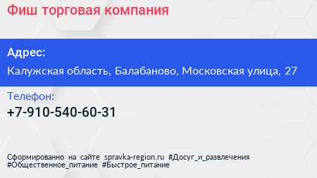 Фиш, торговая компания по адресу Калужская область, Балабаново, Московская улица, 27 в дальнейшем Организация, размещена в следующих категориях: