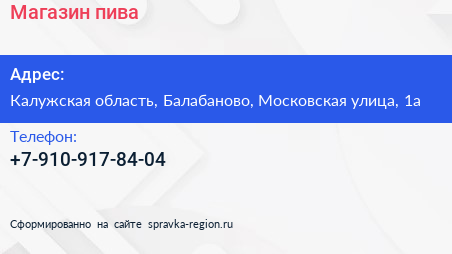 Магазин пива по адресу Калужская область, Балабаново, Московская улица, 1а в дальнейшем Организация, размещена в следующих категориях: