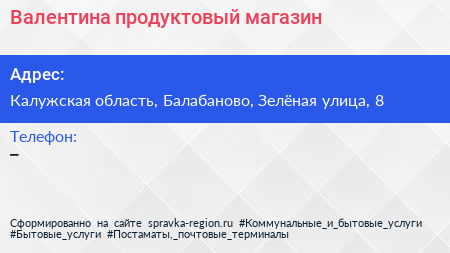 Валентина, продуктовый магазин по адресу Калужская область, Балабаново, Зелёная улица, 8 в дальнейшем Организация, размещена в следующих категориях:
