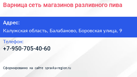 Варница, сеть магазинов разливного пива по адресу Калужская область, Балабаново, Боровская улица, 9 в дальнейшем Организация, размещена в следующих категориях: