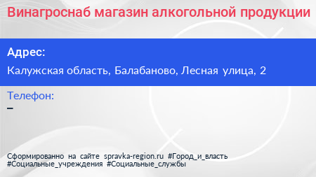 Винагроснаб, магазин алкогольной продукции по адресу Калужская область, Балабаново, Лесная улица, 2 в дальнейшем Организация, размещена в следующих категориях: