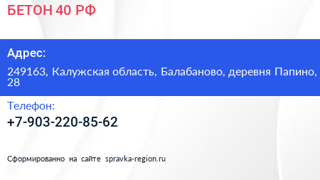БЕТОН-40.РФ по адресу 249163, Калужская область, Балабаново, деревня Папино, 28 в дальнейшем Организация, размещена в следующих категориях: