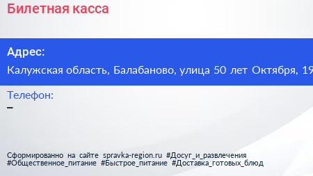 Билетная касса по адресу Калужская область, Балабаново, улица 50 лет Октября, 19 в дальнейшем Организация, размещена в следующих категориях: