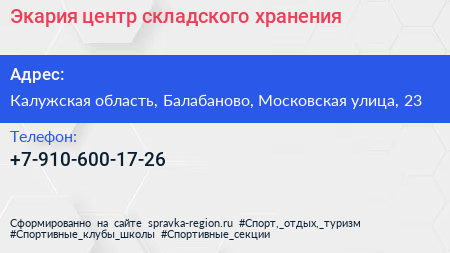 Экария, центр складского хранения по адресу Калужская область, Балабаново, Московская улица, 23 в дальнейшем Организация, размещена в следующих категориях: