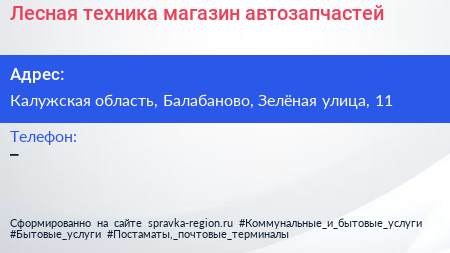 Лесная техника, магазин автозапчастей по адресу Калужская область, Балабаново, Зелёная улица, 11 в дальнейшем Организация, размещена в следующих категориях: