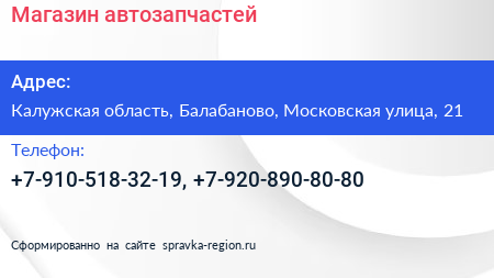 Магазин автозапчастей по адресу Калужская область, Балабаново, Московская улица, 21 в дальнейшем Организация, размещена в следующих категориях: