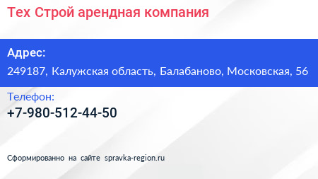 Тех-Строй, арендная компания по адресу 249187, Калужская область, Балабаново, Московская, 56 в дальнейшем Организация, размещена в следующих категориях: