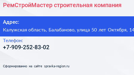 РемСтройМастер, строительная компания по адресу Калужская область, Балабаново, улица 50 лет Октября, 14 в дальнейшем Организация, размещена в следующих категориях: